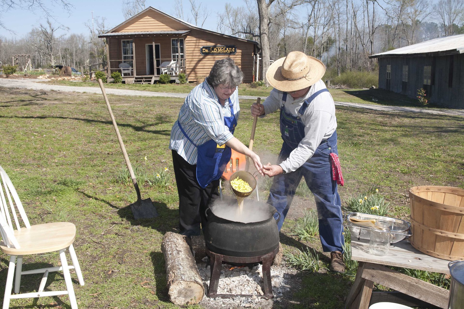 At around noon every Second Saturday, a friendly dinner bell rings at the cookhouse, inviting volunteers and park guests to gather. The Lee County Historical Society welcomes everyone to enjoy a homestyle meal for a donation. It's a delightful way to share stories, savor good food, and support our community's history. Join us as we come together for a delicious meal under the Alabama sky.
